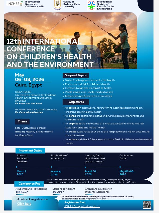 We are writing to announce the 12th International Conference on Children’s Health and the Environment, to be held in Cairo, Egypt at the university of Cairo. Two days are dedicated conference days 0n the 6th and 7th of May. And a final day on the 8th of May will be a training day on different topics. Current scheduled training sessions or workshops: